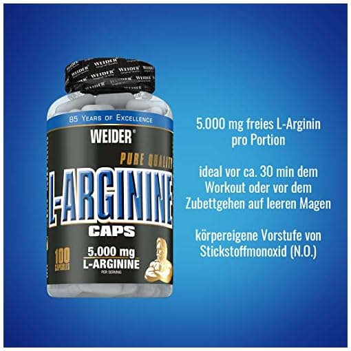 Wer nach den richtigen L-Arginin Kapseln sucht, der ist bei WEIDER L-Arginin Kapseln richtig. Diese liefern 5000 mg hochwertiges L-Arginin pro Portion, in Form von bioverfügbarem Arginin Hydrochlorid. L-Arginin ist eine semi-essentielle Aminosäure, die eine wichtige Rolle bei der Synthese von Stickstoffmonoxid (N.O.) spielt. Dieses Signalprotein erweitert die Blutgefäße und unterstützt so eine bessere Blutzirkulation und einen gesunden Blutdruck. Durch intensives Training oder stressige Situationen kann der Körper die benötigte Menge an L-Arginin nicht selbst produzieren, weshalb eine zusätzliche Zufuhr sinnvoll ist. Die Kapseln sind ideal für Sportler, die ihre Leistung steigern möchten.